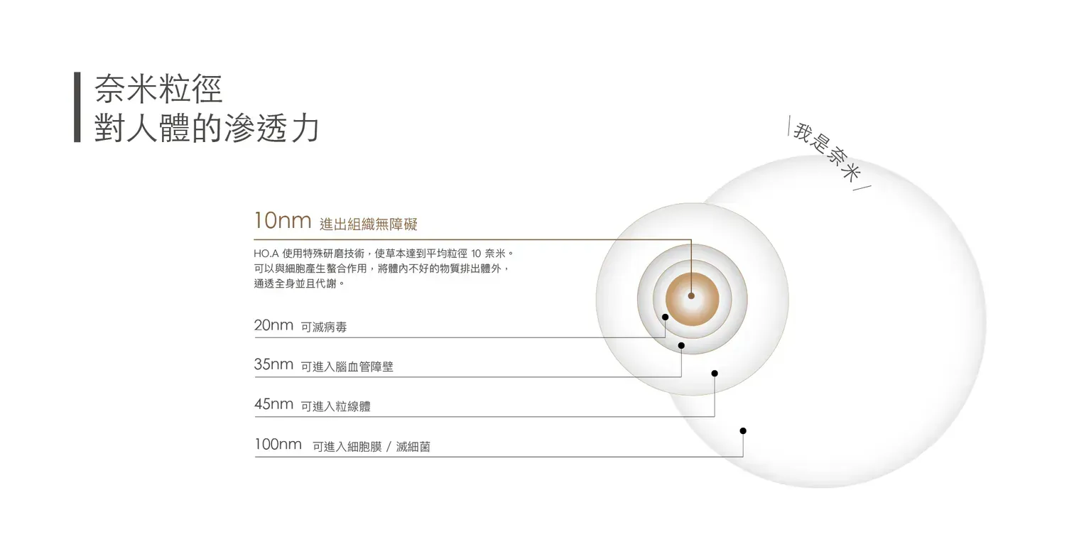 Initially, we wondered if, besides ensuring the ingredients were safe for sensitive skin, we could also enhance the penetration of active ingredients into the skin. This would allow sensitive skin to achieve a radiant, healthy glow while maintaining its stability. We discovered that scientific evidence shows that for skincare essences to penetrate the dermis and restore elasticity, effective and natural ingredients need to be processed at the nanoscale. Therefore, the entire HO.A product line utilizes an exclusive nanotechnology process, grinding natural herbal ingredients to an average particle size of 10 nanometers using a special grinding technique before extraction and addition. This complex and challenging process aims to achieve true "penetration into the skin's base," resulting in better anti-aging effects.